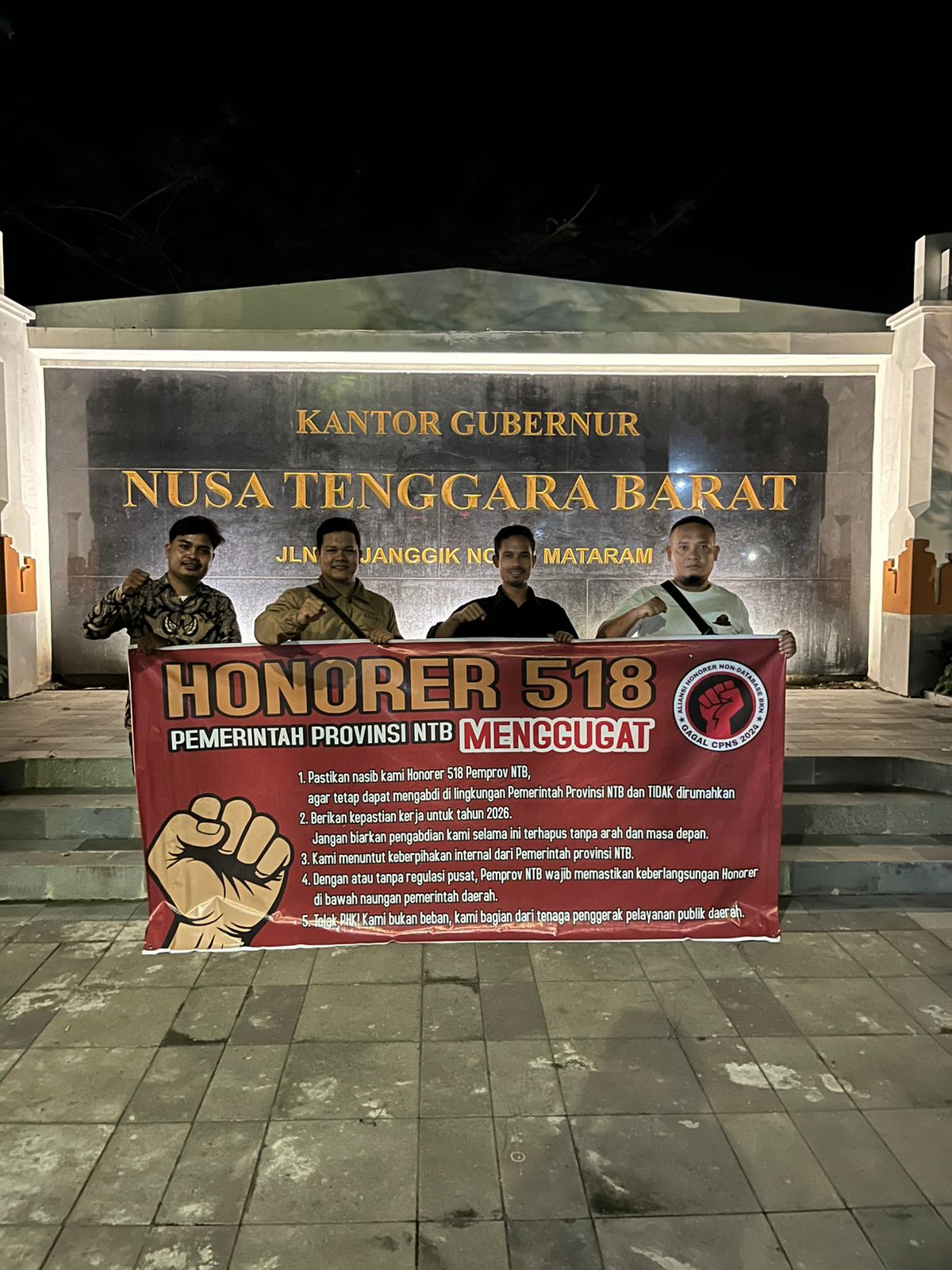1. Pastikan nasib kami Honorer 518 Pemprov NTB, agar tetap dapat mengabdi di lingkungan Pemerintah Provinsi NTB dan tidak dirumahkan.